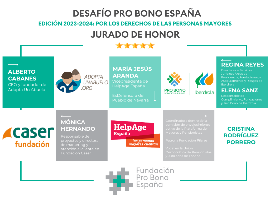 Agradecemos la maravillosa implicación y trabajo de evaluación por parte del Jurado de Honor, conformado por Alberto Cabanes, Mónica Hernando Ruiz, Regina Reyes Gallur y María Elena Sanz Arcas, en representación de las entidades colaboradoras de esta Edición del Desafío: Adopta Un Abuelo, Fundación Caser e Iberdrola, respectivamente; y por dos expertas en materia de los derechos de las personas mayores Maria Jesus Aranda, vicepresidenta de HelpAge International España, y CRISTINA RODRIGUEZ-PORRERO, coordinadora de la comisión de envejecimiento activo y participativo de la Plataforma de Mayores y Pensionistas. Contar con vuestro conocimiento y experiencia sobre los derechos y problemáticas de las personas mayores es fundamental para el éxito del Desafío.