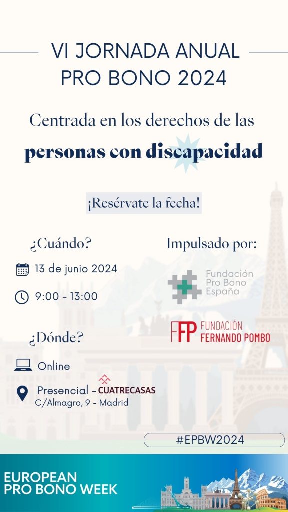 En el marco de la European Pro Bono Week, el próximo 13 de junio celebraremos la VI Jornada Anual sobre Pro Bono 2024, el evento anual de referencia sobre pro bono en España, coorganizado en nuestro país por la Fundación Fernando Pombo y la Fundación Pro Bono España.