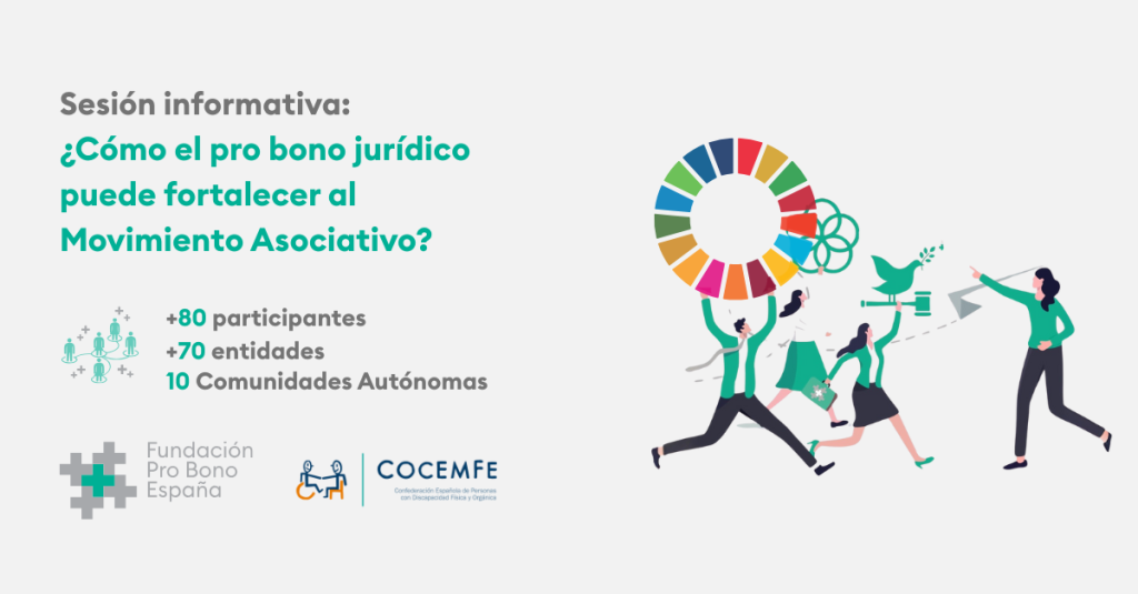 En nuestra contribución a ello, esta semana hemos impartido una sesión informativa dirigida a las entidades confederadas de COCEMFE, con la participación de más de 80 personas de distintas partes de España. Una oportunidad para reflexionar y avanzar juntas sobre cómo el pro bono jurídico puede convertirse en una herramienta estratégica para el Tercer Sector: protege a las organizaciones, amplifica su misión social y potencia su capacidad de incidir en la defensa de los derechos de las personas a las que se dedican.