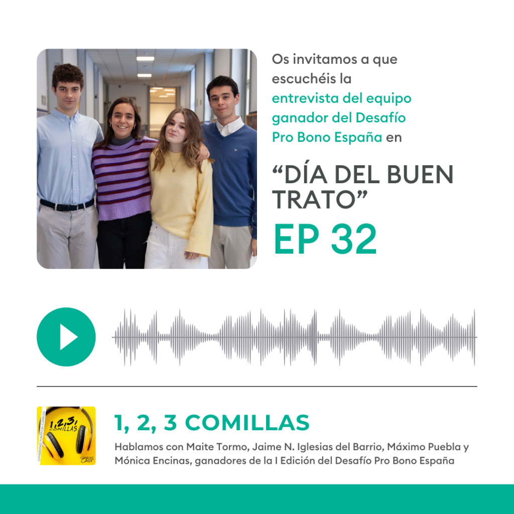 Como destaca el equipo vencedor de la I Edición, formado por estudiantes de 2º curso de Derecho y Filosofía Política y Economía de la Facultad de Derecho (Comillas ICADE), participar en el Desafío en el marco de su clínica jurídica ha sido sobre todo una oportunidad única de aprendizaje y sensibilización para “explorar una faceta mucho más social del Derecho” (lee la noticia completa aquí). Asimismo, durante su intervención en la entrevista para “1,2,3 Comillas”, la agenda semanal de la Universidad Pontificia Comillas ICAI-ICADE en formato podcast, destacan que su propuesta para el Desafío busca conseguir un cambio real y darles un nuevo alcance a sus conocimientos en Derecho para ponerlos a disposición de la vida de las personas. Podéis escuchar el podcast al completo a través de este enlace o en la página web de la universidad.
